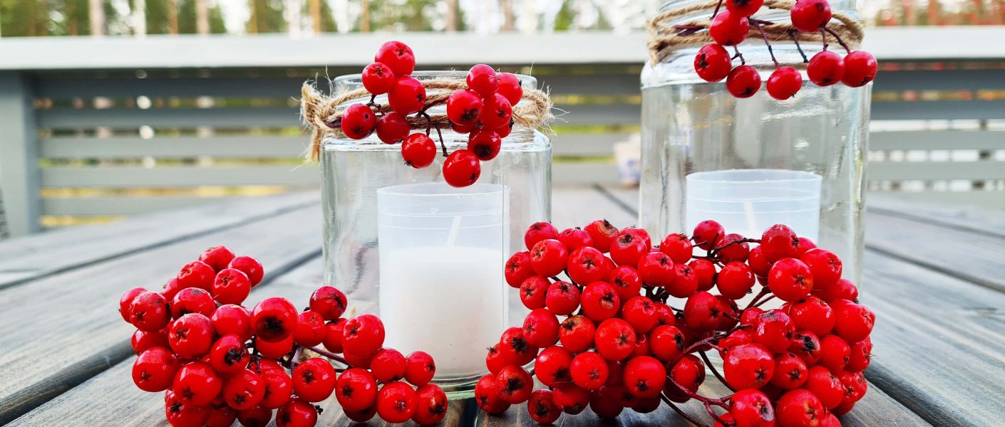 Luonto tarjoaa ehtymättömän inspiraationlähteen kauniisiin ja niiden avulla saa toteutettua edullisia DIY projekteja. Syksy on erityisen otollista aikaa kerätä materiaaleja, kun puut ja pensaat ovat täynnä väriloistoa. Pihlajanmarja on kaunis marja, josta saa tehtyä hilloa ja mehua. Harva taitaa jatkojalostaa näitä terveyspommeja, joten tässä ideoita miten pihlajanmarjoja voi käyttää koristeluun! Marjojen kirkas punainen väri tuo upeaa kontrastia ruskan sävyihin, ja niistä saa todella kauniita yksityiskohtia koristeisiin. Pihjalanmarjojen kerääminen kuuluu jokamiehenoikeuksiin, mutta toisten pihoilta niitä ei saa mennä keräilemään.